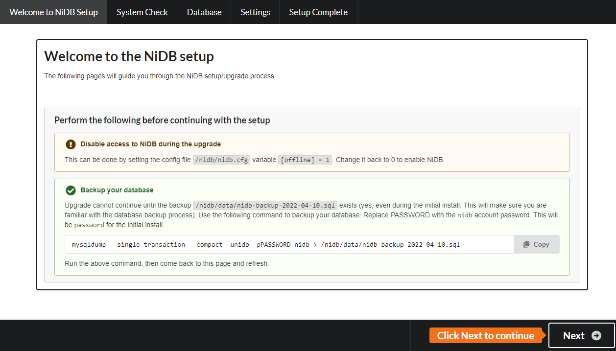 Copy the mysqldump command and run that on the command line. It should create a .sql file that contains a backup of the database. This is required even for new installations because you should become familiar with, and get int the habit of, backing up the SQL database. After you've backed up the database using mysqldump, refresh the setup page and it should allow you to continue with the setup.