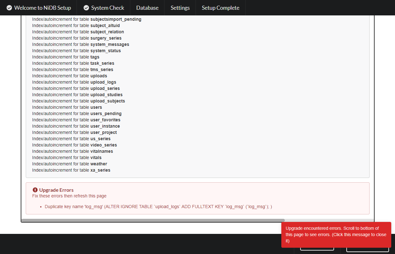 If any errors occur during upgrade, they will be displayed at the bottom of the page. You can attempt to fix these, or preferably seek help on the NiDB github support page! Click the red box to dismiss any error messages. Click Next to go to the next page which will show the configuration variables.