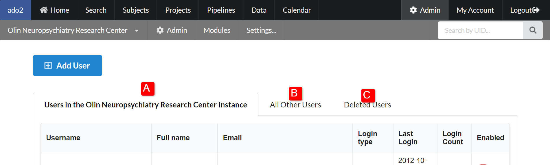 There are 3 options of where to find users A) users in the current instance (switch instance by clicking the instance list in the upper left menu) B) users not in the current instance C) deleted users