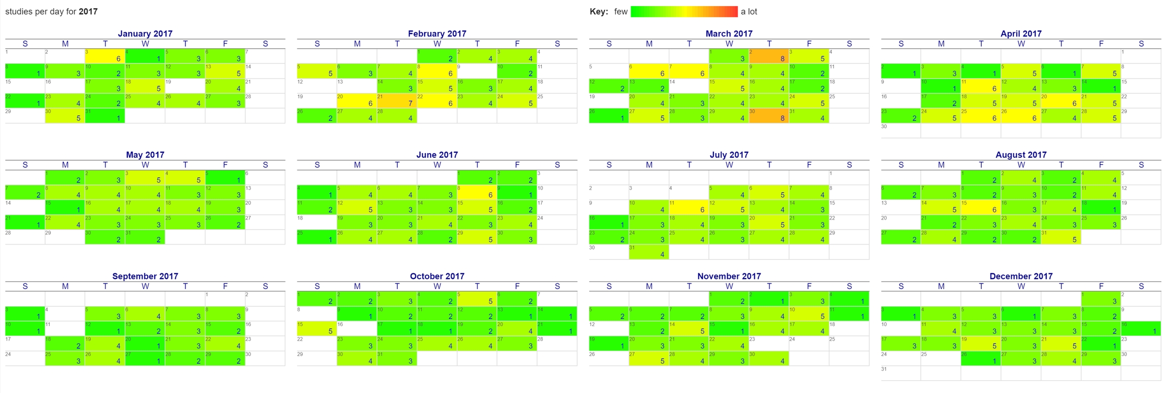 Reports of imaging studies (often used for billing/accounting purposes on MRI equipment for example) are organized by modality or equipment. Clicking any of the 'year' links will display a calendar for that year with the number of studies per day matching the specified criteria. Clicking the month name will show a report for that month and modality/equipment. Clicking the day will show a report of studies collected on that day.