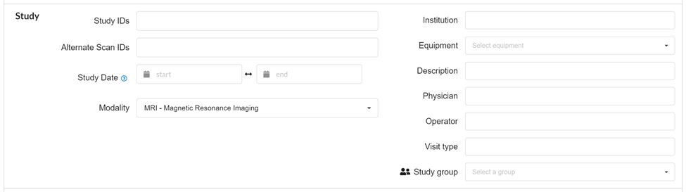 In this part search parameters / variables in a project / study can be defined to refine the search. A search can be restricted based on, study Ids, Alternative study IDs, range of study date, modality (MRI,EEG, etc.), Institution (In case of multiple institutions), equipment, Physician name, Operator name, visit type, and study group