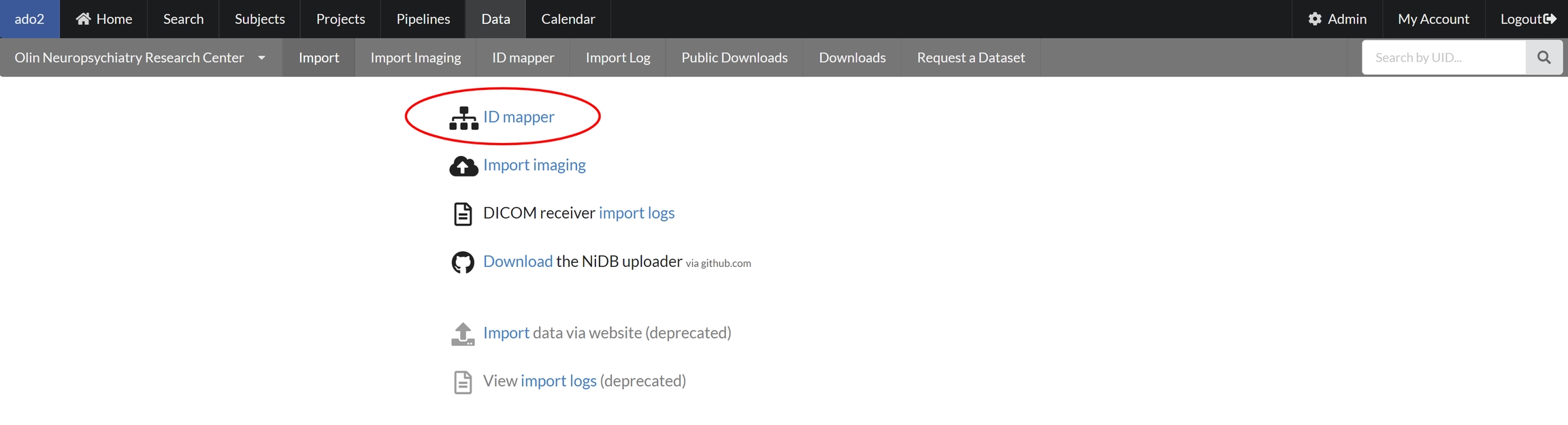 The Ids can be mapped using the "Data" menu from the main menu. One can go to the Id-maper page by clicking on the "ID mapper" link as shown below or by selection the ID mapper sub-menu.