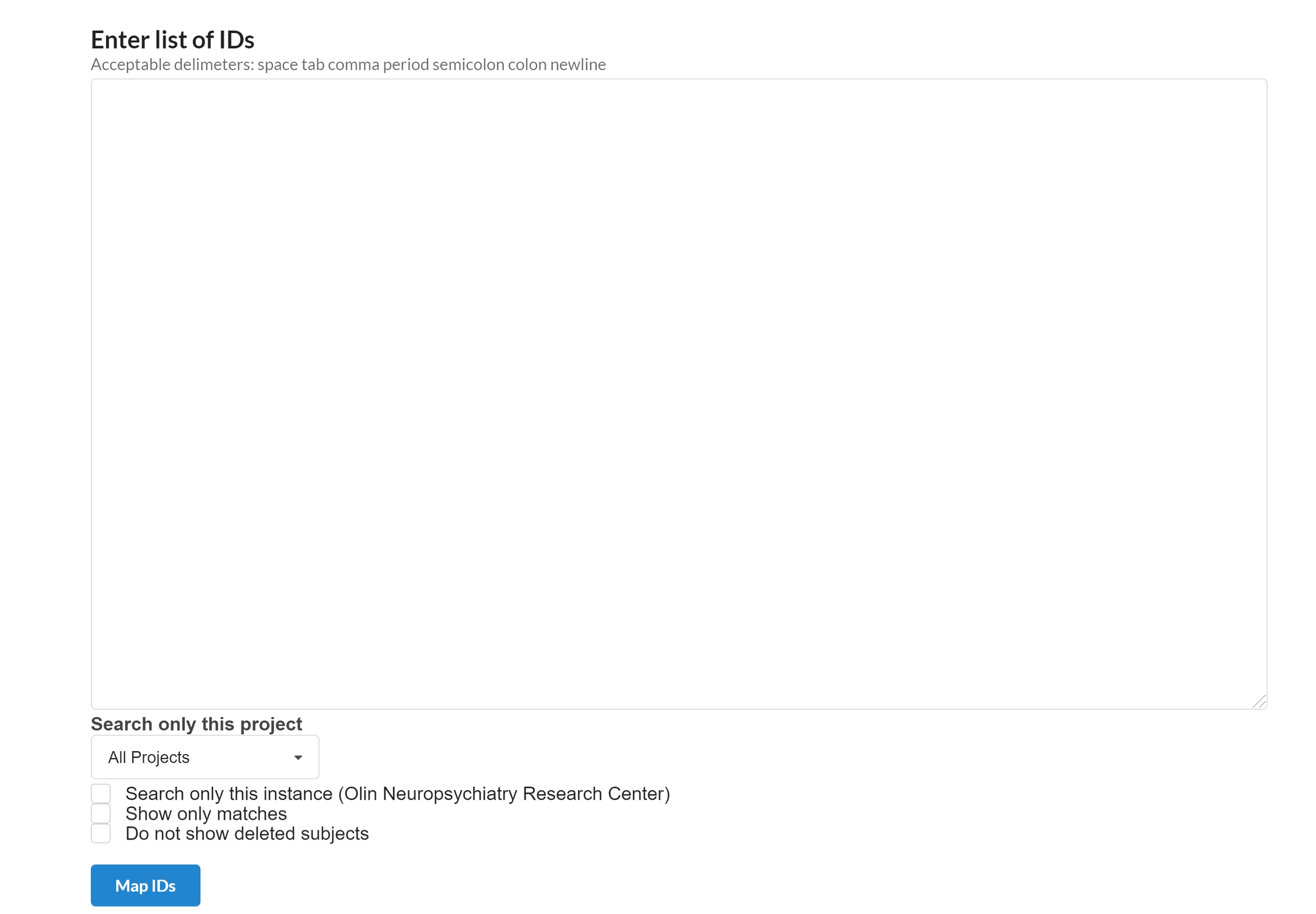A list of Ids to be mapped separated by space, tab, period, semicolon, colon, comma and newline can be typed in the box above. the mapping can be restricted to a certain project by selecting the project name from the dropdown menu. The search can only be restricted to the current instance, undeleted subjects and exact matches by selecting the approprriate selection box shown above.