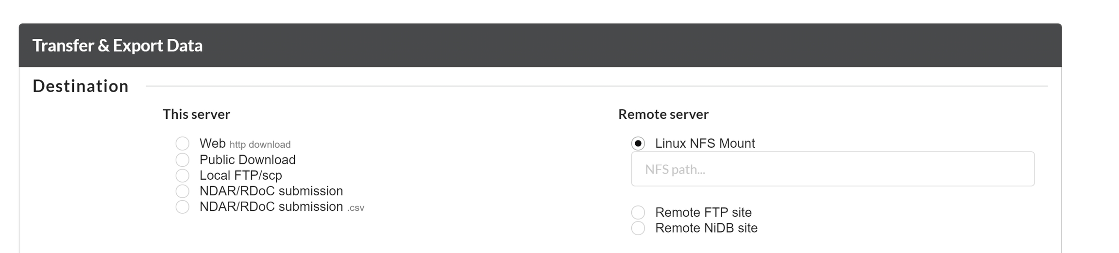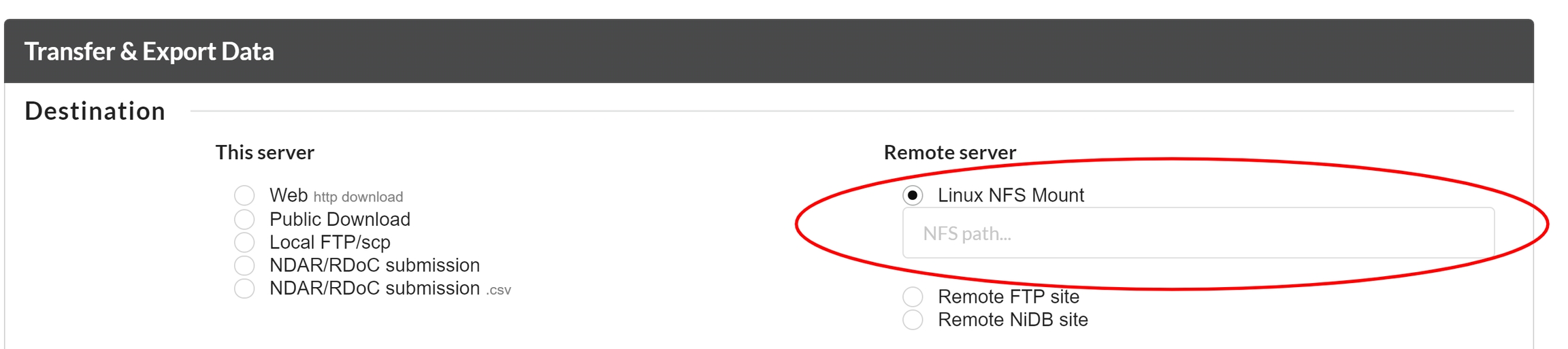 To export the data to a NFS location, you can select the "Linux NFS Mount" option and type the NFS path where you want to download the data.