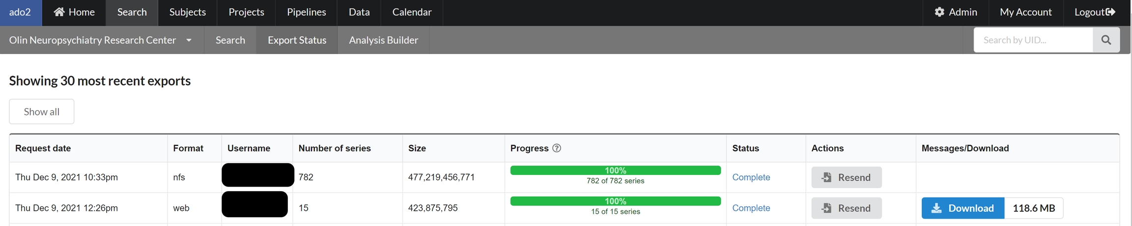 After starting the transfer by clicking the transfer button at the end of the search, a transfer request will be send to NiDB. The status of a request can be seen via Search-->Export Status page as shown below. The status of 30 most recent serches will be shown by default. All the previoius searches can be seen by clicking on the "Show all" button on the left corner of the screen as shown below.