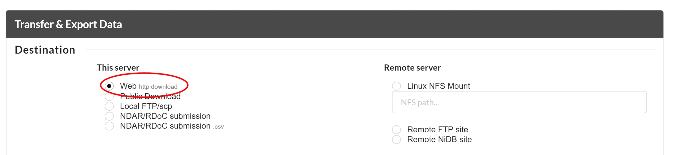 To export the data to a remote NiDB site, you can select the "Remote NiDB Site" option and select the NiDB site from a drop down menue where you want to download the data.