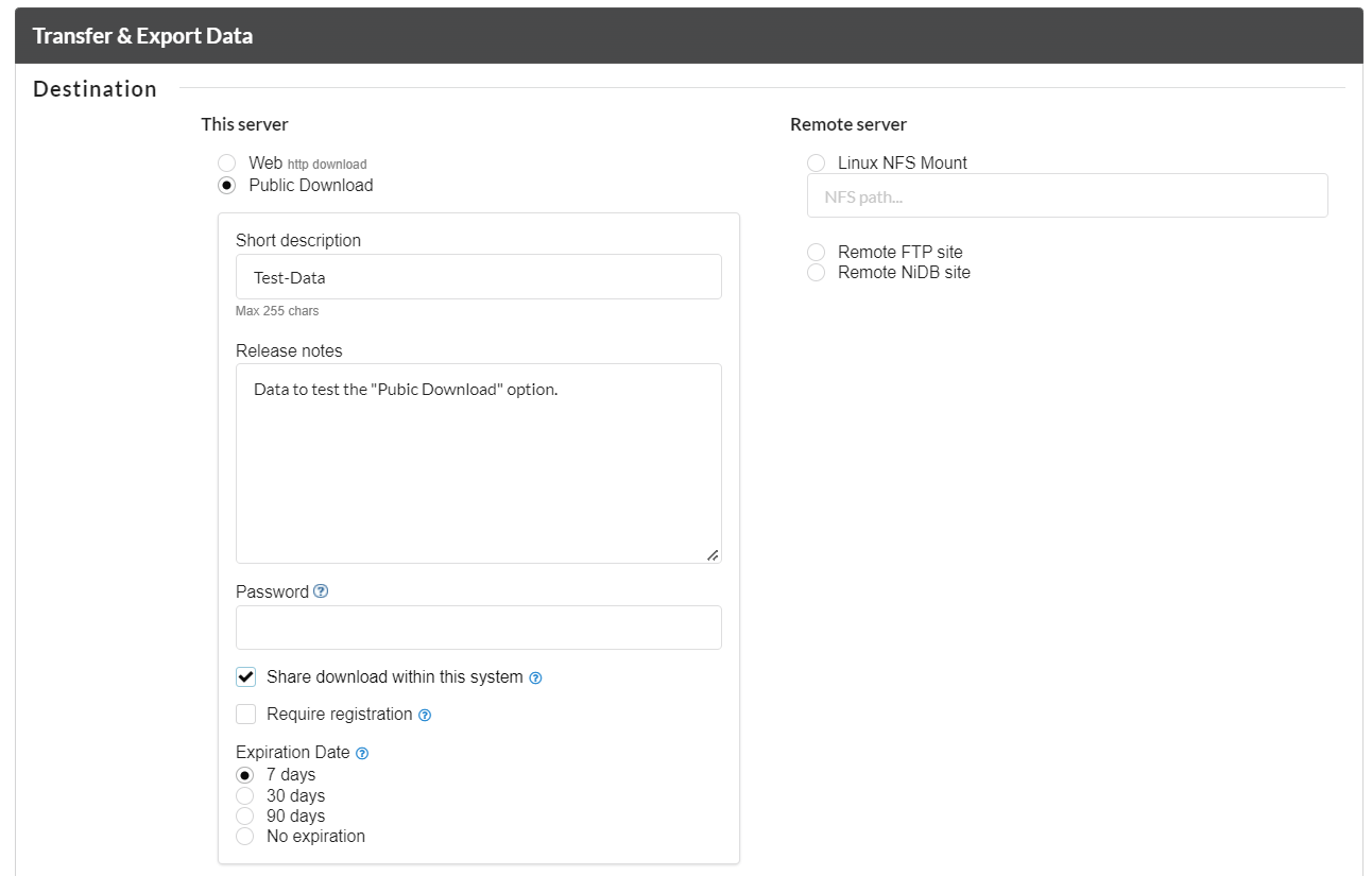 This is another option in the "Transfer and Export" section to transfer "searched data" and to make it as public downloadable. There are options to describe briefly about the dataset, setting up a passowrd for secure tranmitability and making the public download updateable to the users having rights on the data. One can select "Required Registration" option to restrict the dowload to NiDB users only. An expiration date for the download can be set to 7, 30 and 90 days. One should select "No Expiration" if the public data should be available for longer than 90 days or for indefinite period.