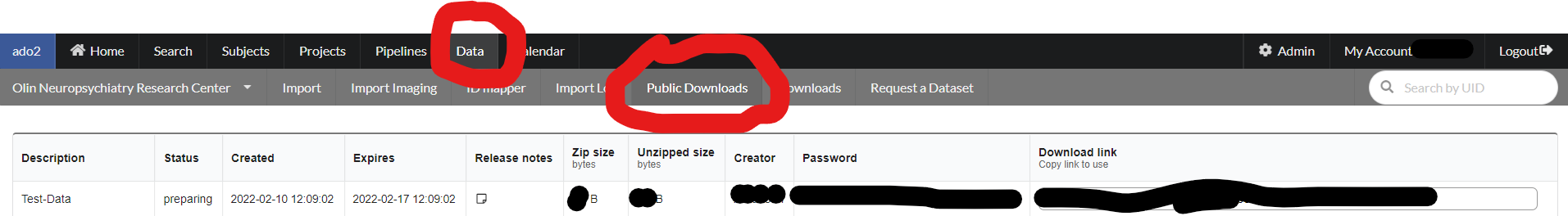 The "public Download" will be created after pressing the "Transfer" button at the end of search page. The public downloads can be accessed via Data --> Public Download menue. The following is a a page with Public download information: