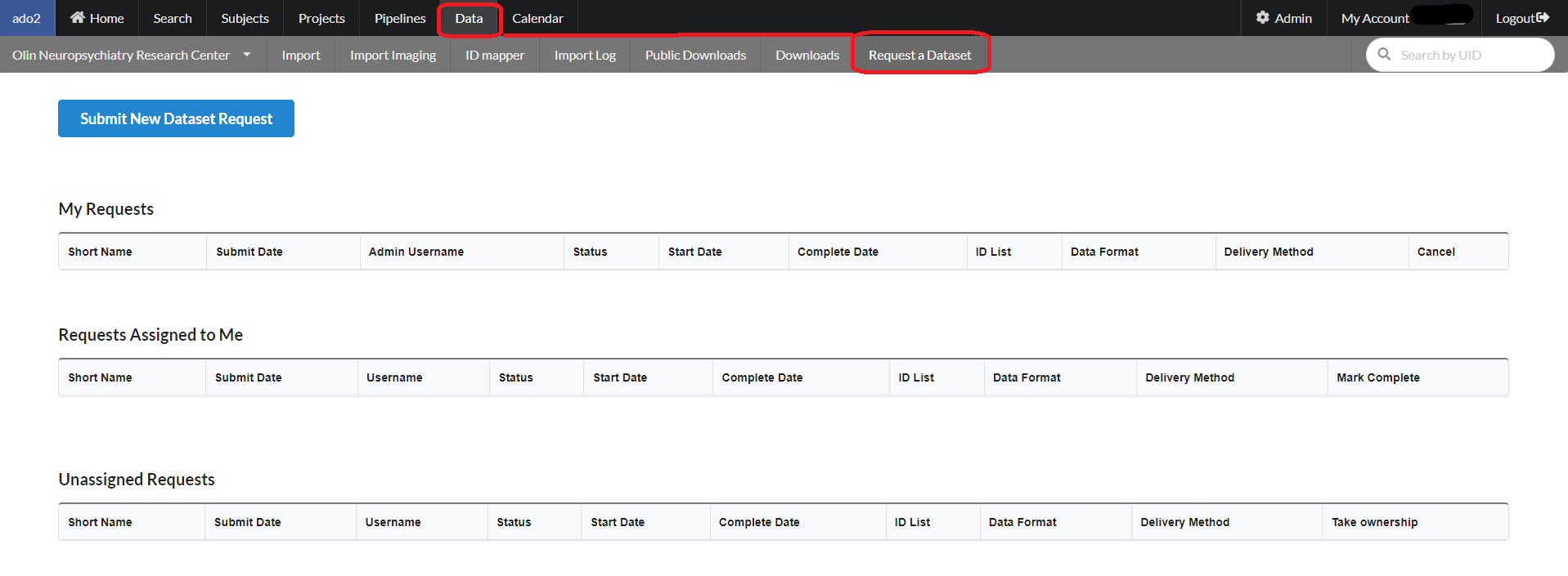 To request a dataset from NiDB-based database, select Data --> Request a Dataset. The following page will appear.