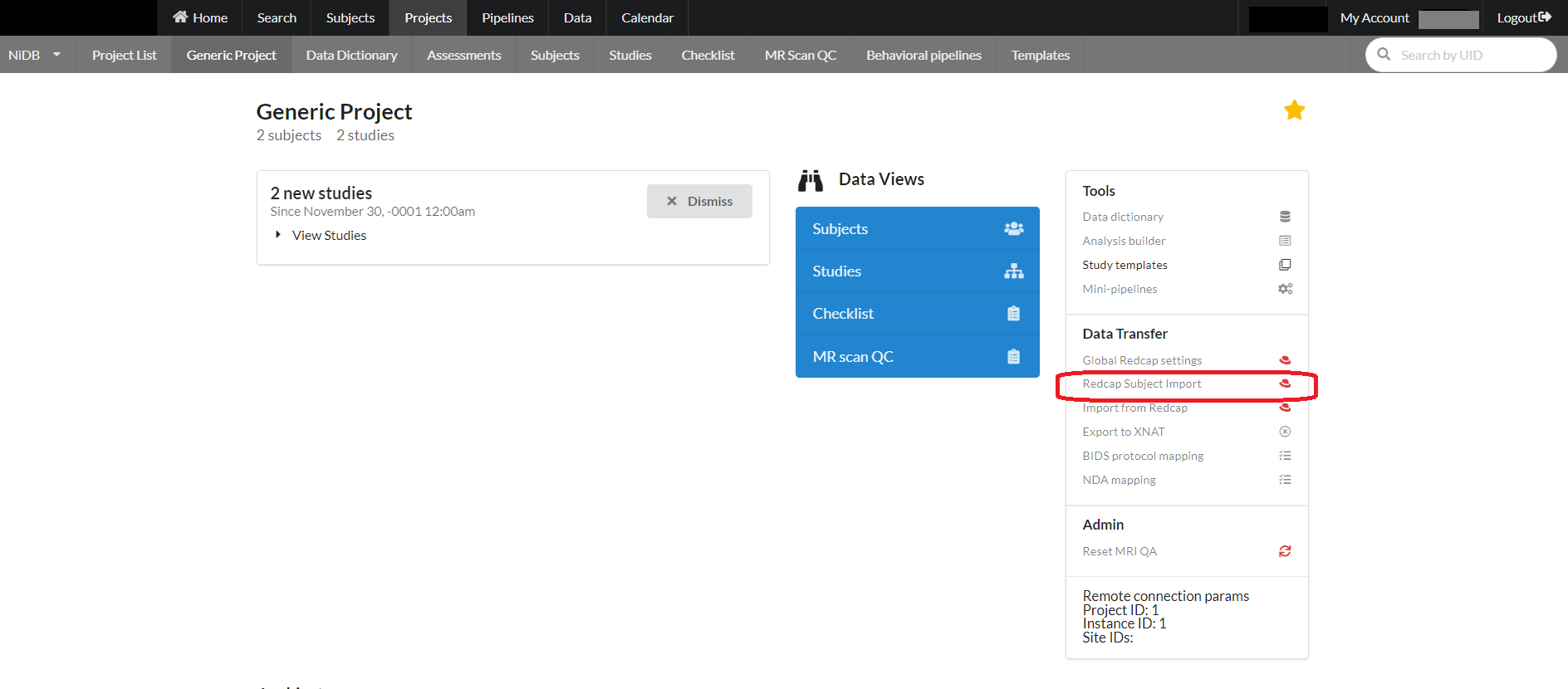 For a project, subjects can be imported from redcap using an option on the project page as shown below: