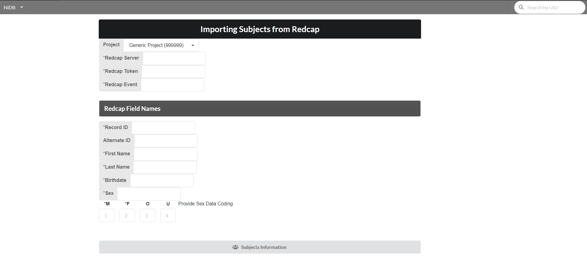 Fill the following form requiring information for API connection to redcap and required redcap field names. After providing the required fields click "Subjects Information" button.