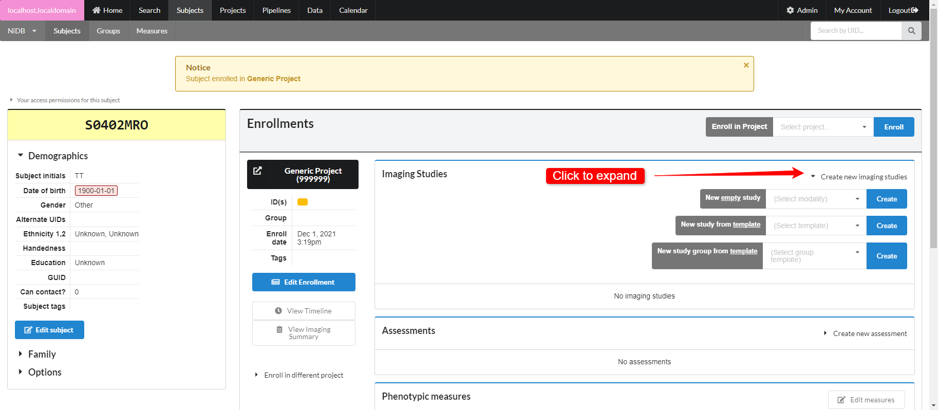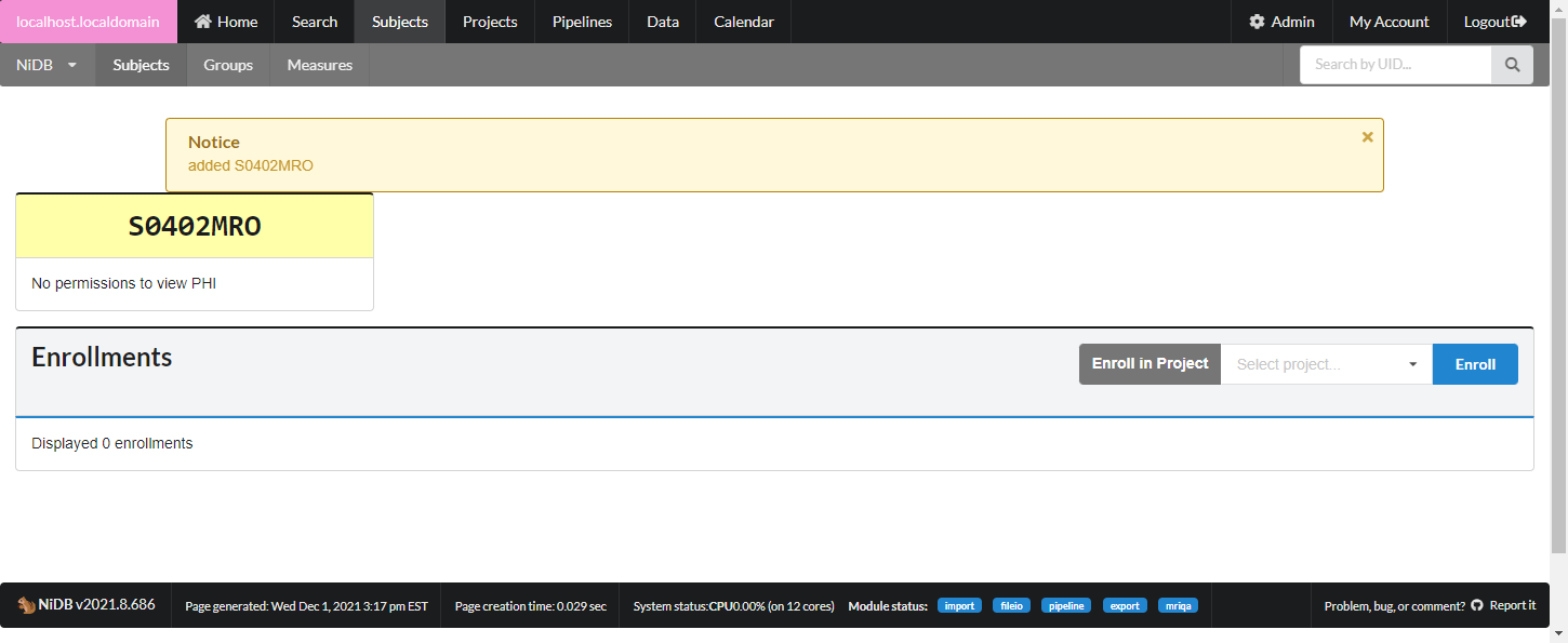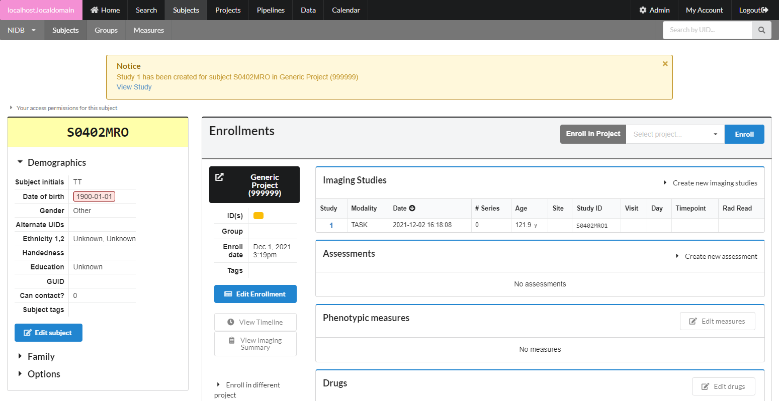 The subject will now be assigned a UID, but will not be enrolled in any projects. Enroll the subject in the next section.