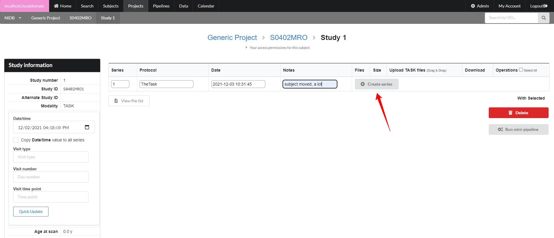 Non-MRI data be imported automatically or manually. To manually import non-MRI data, first go into the imaging study. Then fill out the series number, protocol, date, notes. Series number and date are automatically filled, so change these if you need to. When done filling out the fields, click Create Series.