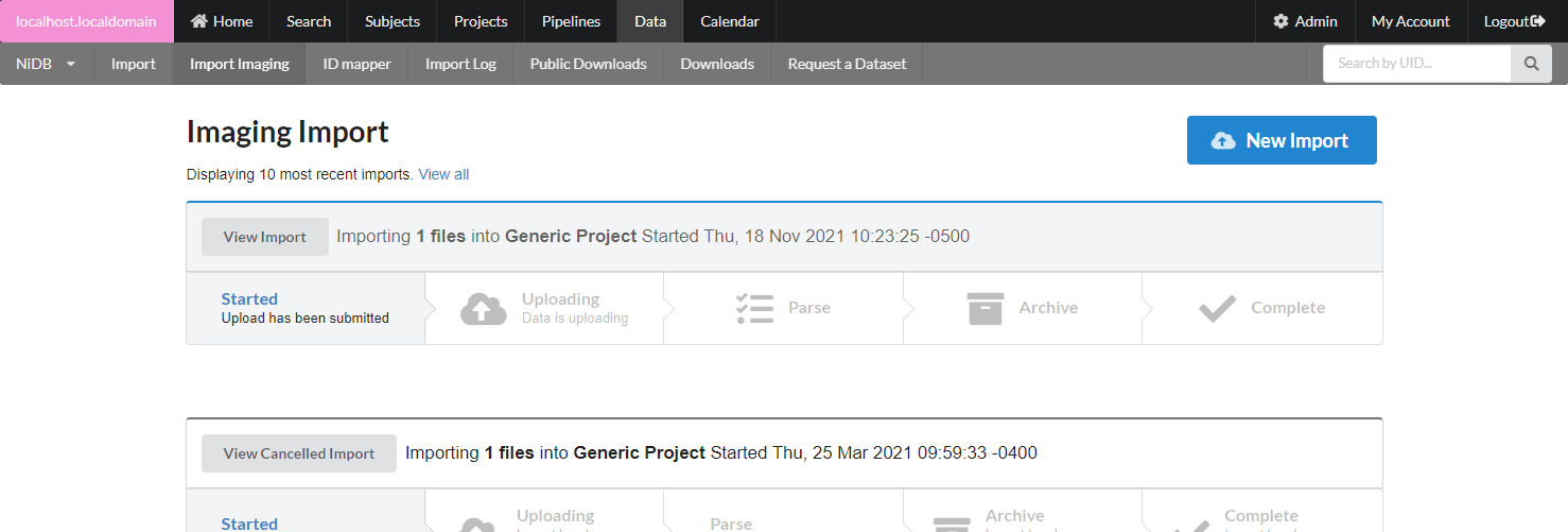 The imaging import page can be accessed by the Data → Import Imaging menu. Because datasets can be large and take hours to days to completely import and archive, they are queued in import jobs. To import a dataset, click the New Import button.