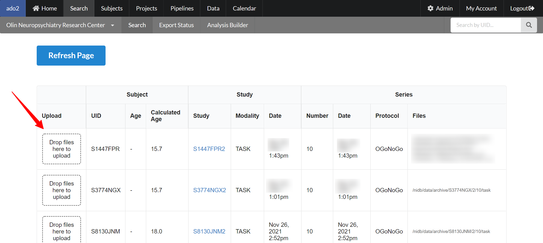 Drag and drop files onto those series, and click Refresh Page to view the newly uploaded files.