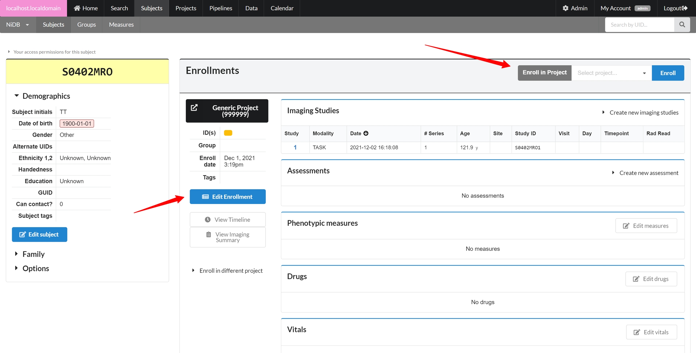On the subject's main page, you'll see a list of enrollments on the right hand side. To enroll the subject in a new project, select the project and click Enroll. This will create a new enrollment.
