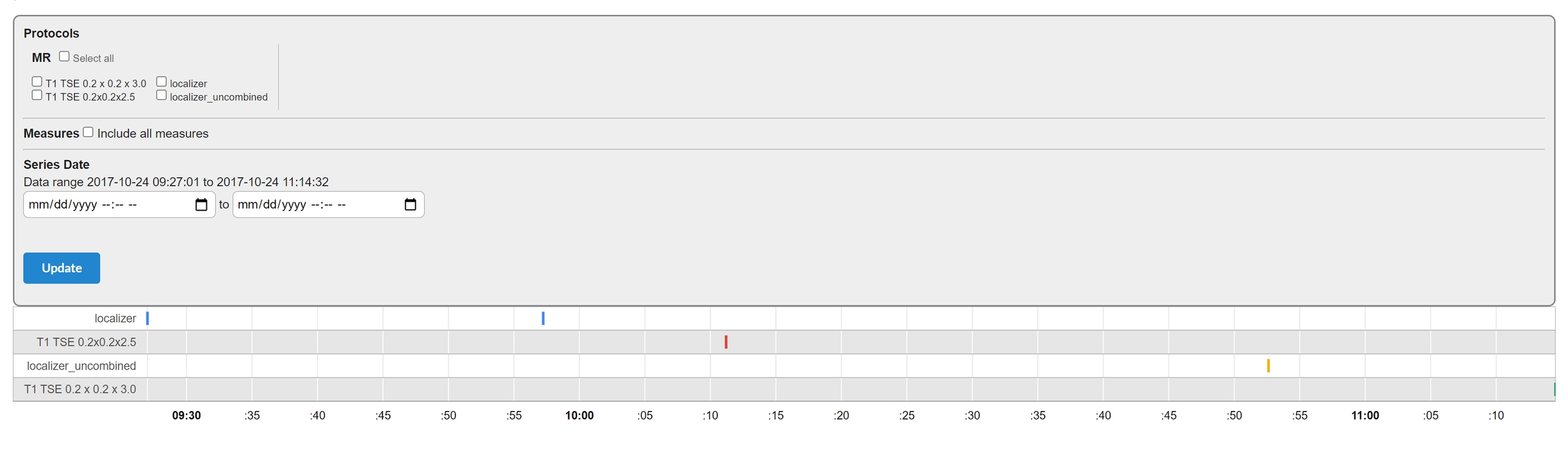 For projects with a chronological component, you can view a timeline of series for this enrollment. Click the View Timeline button on the subject's page, for the enrollment. It will display a timeline of series. Bottom axis displays the date/time. You can change the parameters of the timeline by selecting date range or series.