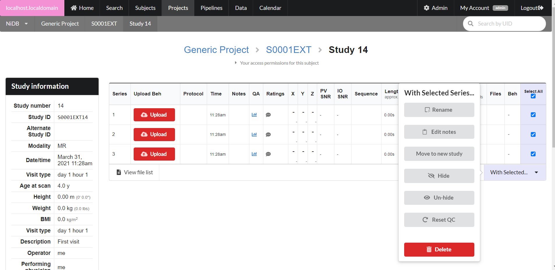 If the study is an MR modality, you can upload behavioral data by dragging and dropping files onto the Upload button. Behavioral files can be edited by clicking on the number under the Beh column.