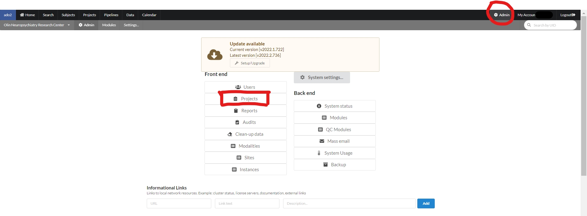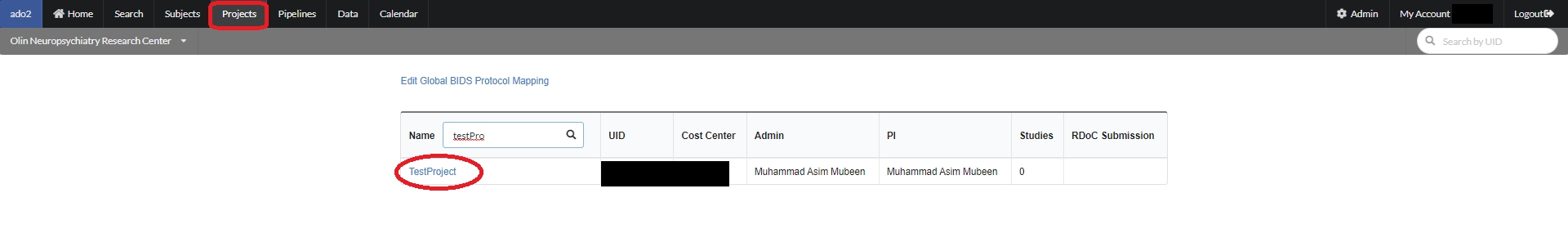 A user with admin rights can create, and manage a project in NiDB. A user with Admin rights will have an extra menu option "Admin". To create a new project in NiDB, click "Admin" from the main menu and then click "Projects" as shown in the figure below.