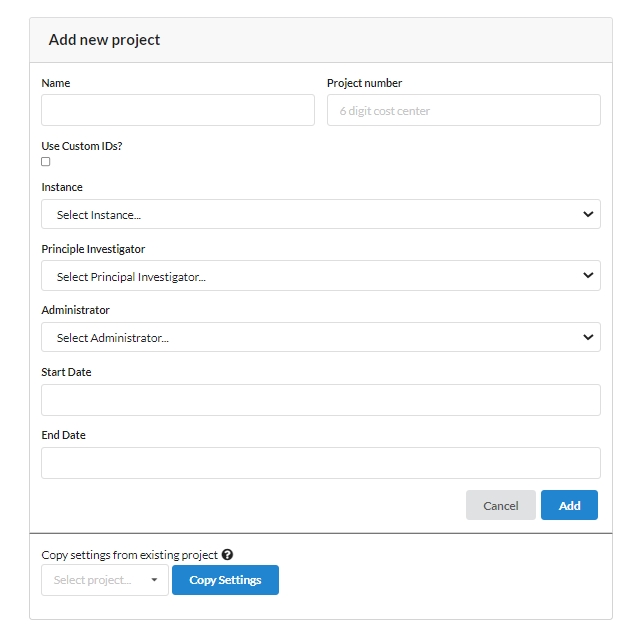 On the next page, fill the following form related to the new project. Name the new project, fill the project number. Select the option "Use Custom IDs" if project need to use its own ID system. Select the Principal Investigator (PI) and project administrator (PA) from the existing NiDB users. The PI and PA can be the same subject. Mention the start and end date if they are known. Also there is an option if you want to copy an existing setting from one of your projects.