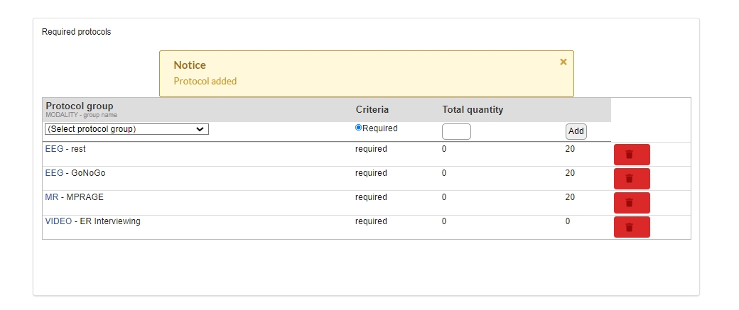 After adding the required set of protocols, a list of protocols will be shown as follow. A protocol can be deleted by clicking the "delete" button in front of an added protocol as shown in the figure below.
