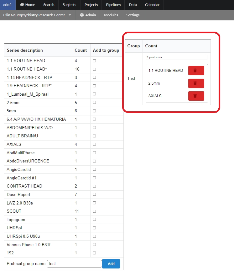 To define a protocol, click on the name of a protocol in the above list. For example if we click on EEG-Rest, the following page will appear with the existing list of EEG-series being already used in various projects. You can pick any of those to add to your own protocol group. A group name can be assigned by using the "Protocol group name" box at the end of the page as shown. After clicking the "Add" button the selected series in the group will be added to the group and will be shown on the right.