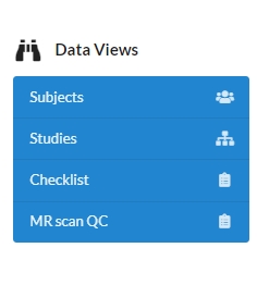 In the middle of a project page is "Data Views" for subjects, studies, checklist for subjects and an option to QC the MR scans.