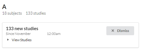 A project page consists of some information regarding the current project. Under the project name there is total number of subjects and studies. Undeneath that is a message box consists of number of studies. One can dismiss this message box by clicking "dismiss" button or view all the studies inside the message box.