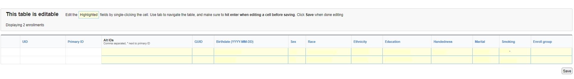 To update information regarding the subjects in the current project, click on the "Subjects" button in the data view, a page will appear where the information can be updated for all the subjects and can be saved at once by clicking "Save" button at the end.