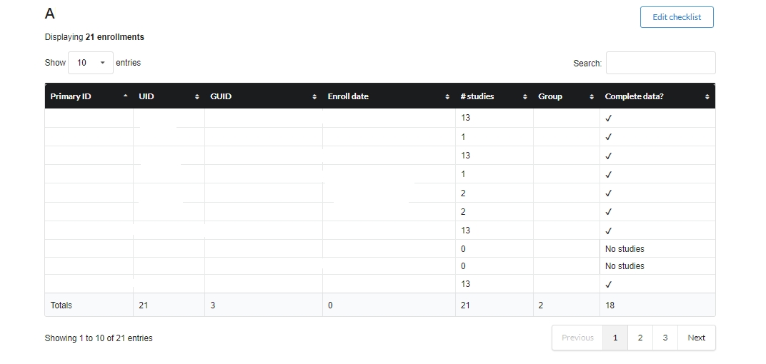 The last section of a project page consists of a list of subjects registtered, with its alternate Ids, GUID, DOB, Sex, and status as shown below: